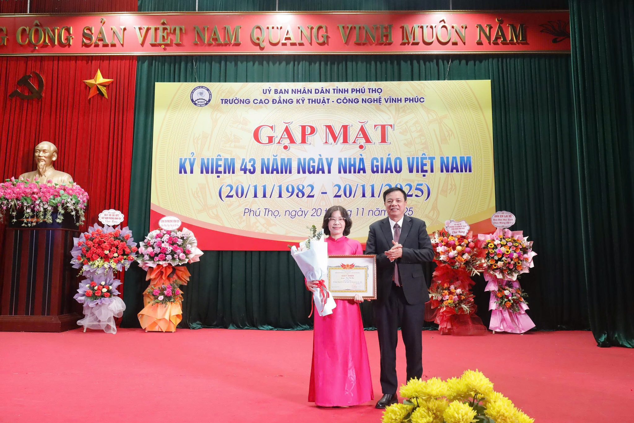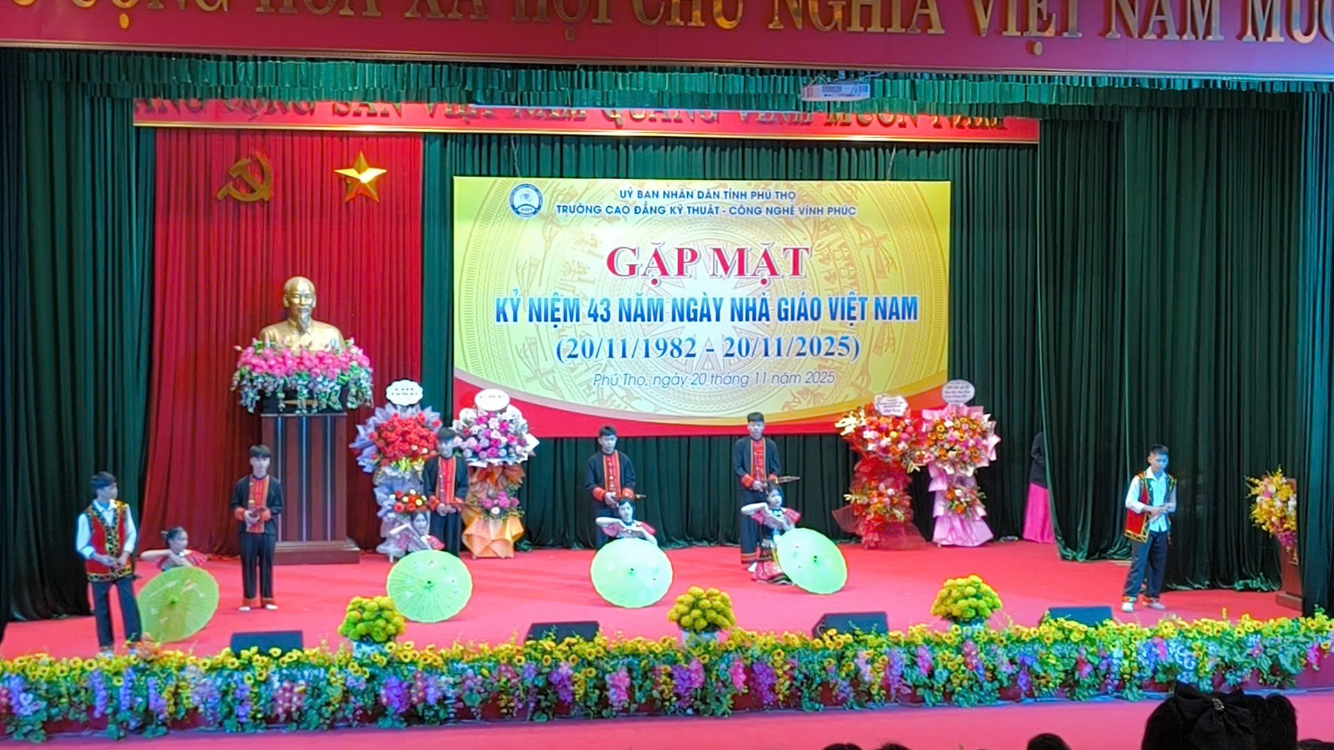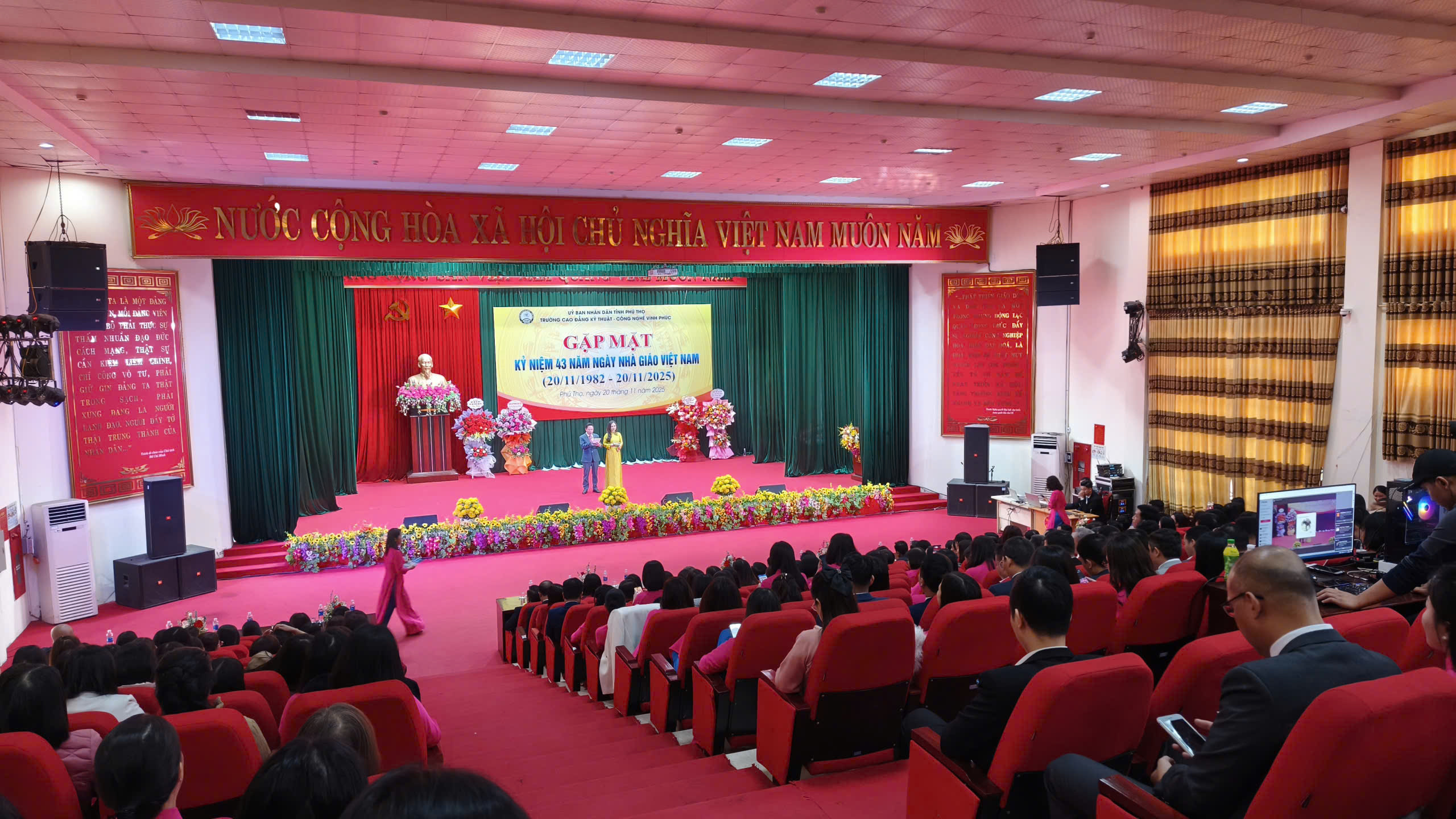 Sáng ngày 20/11/2025, tại Hội trường lớn, Trường Cao đẳng Kỹ thuật Công nghệ Vĩnh Phúc long trọng tổ chức Chương trình gặp mặt Kỷ niệm 43 năm Ngày Nhà giáo Việt Nam (20/11/1982 – 20/11/2025) trong không khí trang trọng, ấm áp và đầy ý nghĩa. Tham dự buổi lễ có các đồng chí đại biểu cấp trên; tập thể Đảng ủy, Ban Giám hiệu; nguyên lãnh đạo nhà trường qua các thời kỳ; cán bộ, giảng viên, nhân viên cùng đại diện hơn 6000 học sinh – sinh viên toàn trường.